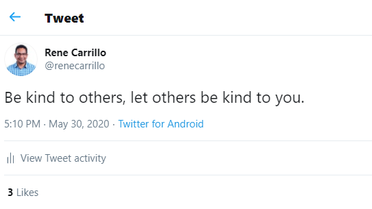 My immediate response to posting original tweets for one year was “no freaking way!” and “That’s too much of a commitment!” But later I started to reconsider. I told myself that since a tweet must be 280 characters or less, it’s actually a very doable goal for me. One of my goals is to write blog posts like this one more regularly. Writing tweets would be a good warm up. I also want to improve on being consistent, so this is a perfect way to do that too. So, on May 30, 2020, @renecarrillo wrote his first original tweet.