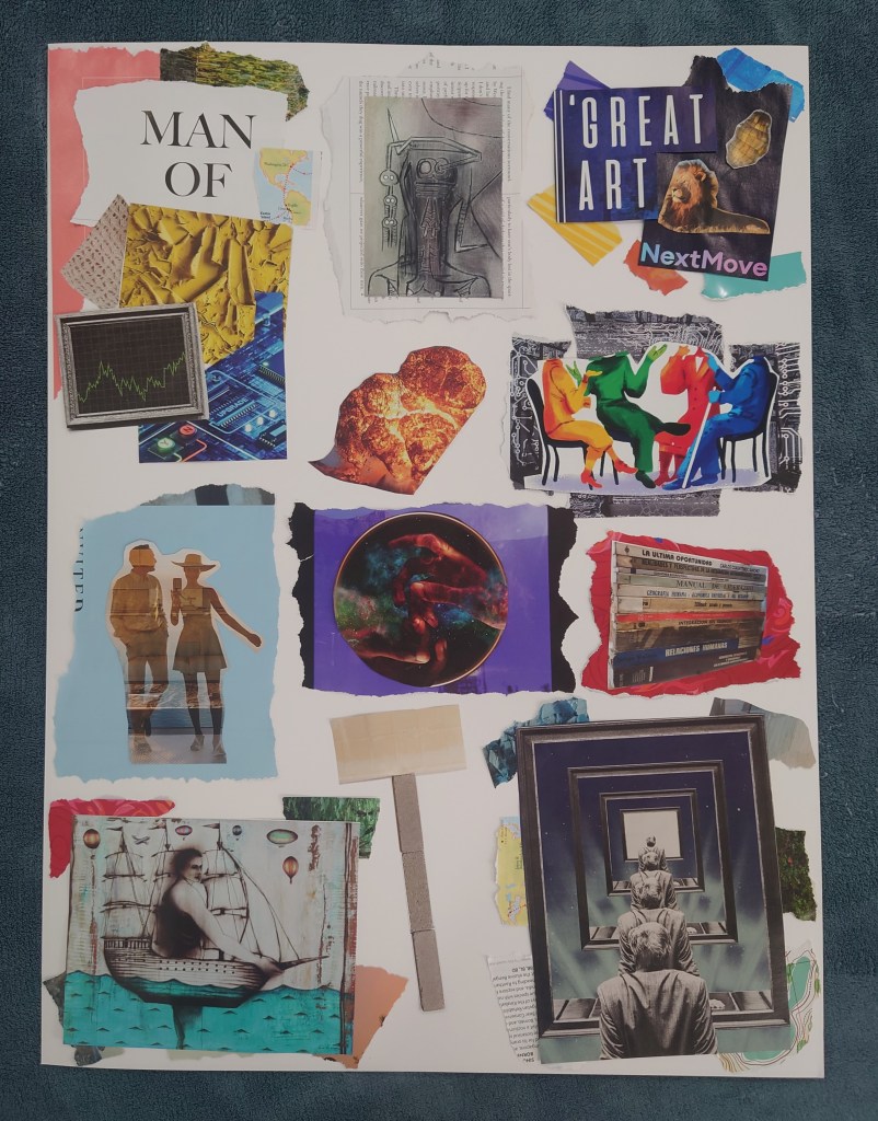 Then I also learned from the other students that you could be playful with the collage. One of them created a “pocket” in one of the figures, which would open up and have a message inside, but only if viewer would notice it. Another one purposely created borders to the collage which would overrun the official paper we were given. I would find out later that she meant it as purpose defiance of limits and rules. Brilliant! Another one created three smaller collages that told a story if placed together. Or not. It was all about interpretation.